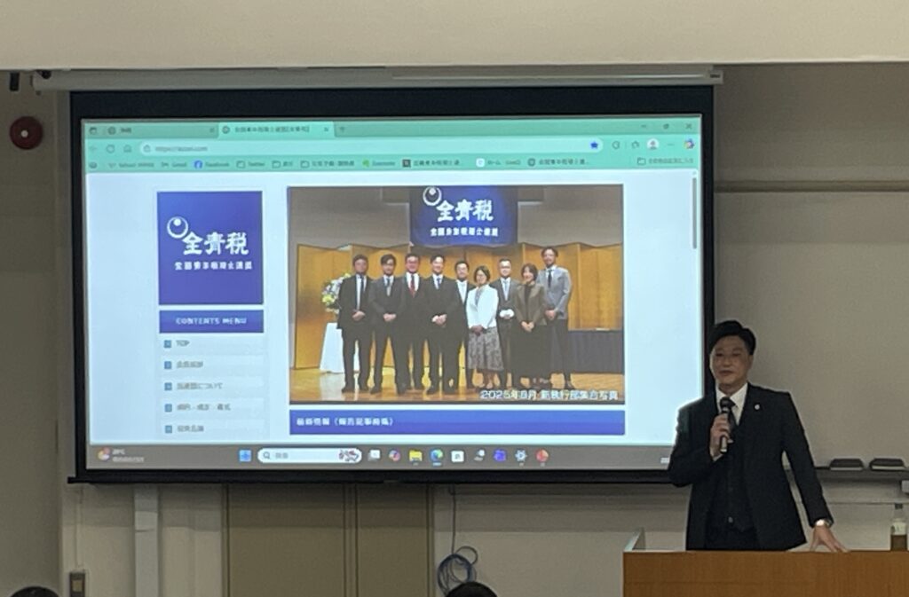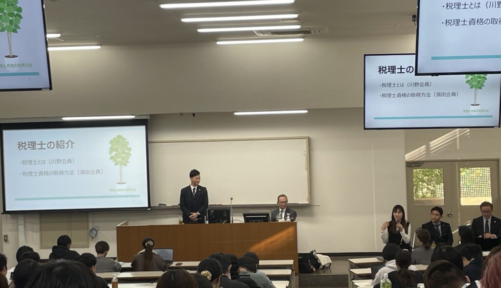 昨年に続き、法学部の青木丈先生のご厚意により授業の1コマ(90分)をいただき、学生約140名を対象に、税理士という職業とその魅力についてPRをしてまいりました。